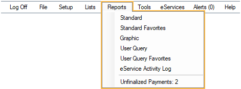 - User Query: Open the User Query window to generate custom reports to view data that may not be available in a standard report.
