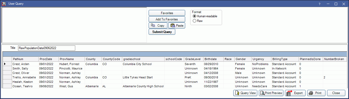 For offices utilizing Public Health features, the Raw Population Data report produces a list of patients who had treatment during a specific date range.