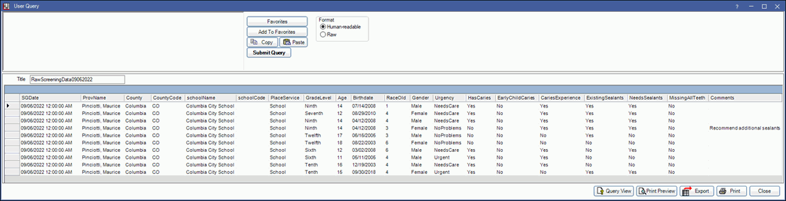 For offices utilizing Public Health features, the Raw Screening Data report produces Public Health Screening data as a single table for a selected date range.