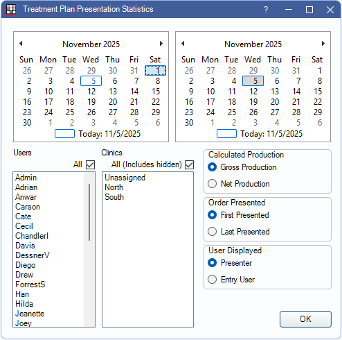 Order Presented: Production for procedures on multiple treatment plans is only counted once. Select how production is attributed.