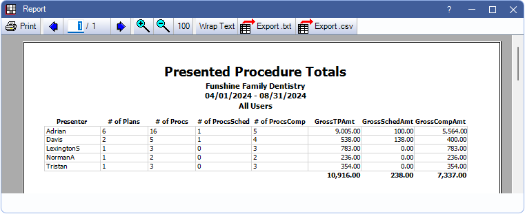 - GrossCompAmt: The total gross amount for all completed procedures in Saved Treatment Plans in the date range.