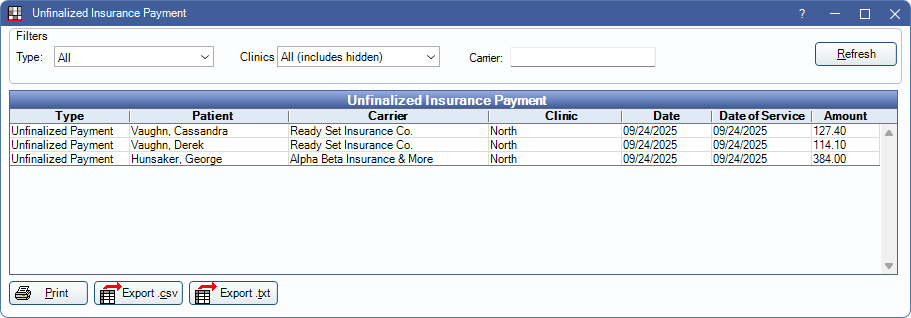 Run the Unfinalized Insurance Payments Report to locate insurance payments that need to be finalized.