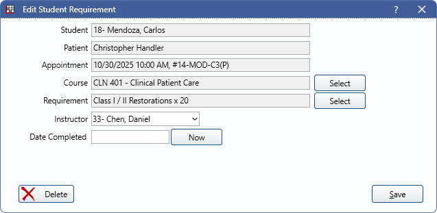 For Dental Schools, requirements are added to courses, attached to appointments, then managed by students and instructors.