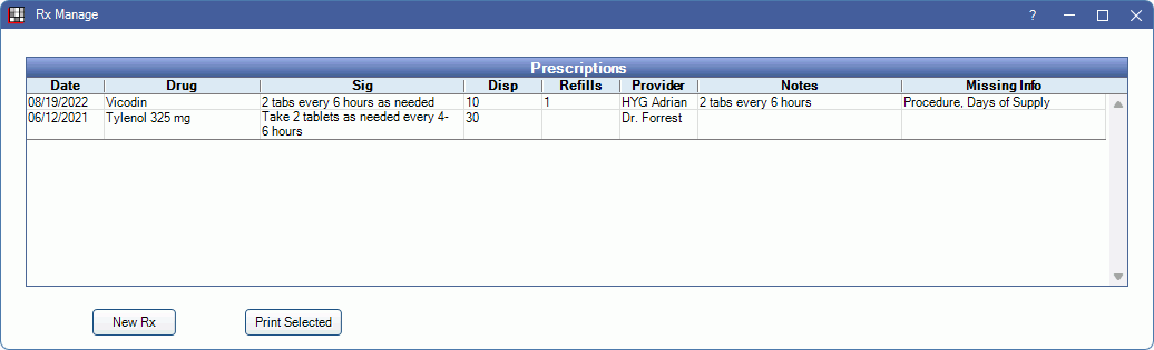 Use Rx Manage to prescribe and manage paper prescriptions for the selected patient.