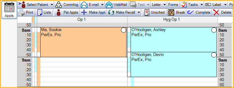 Appointments Module: The Appointments Module displays the operatory headers in gray. Each operatory includes the provider time for the provider scheduled.