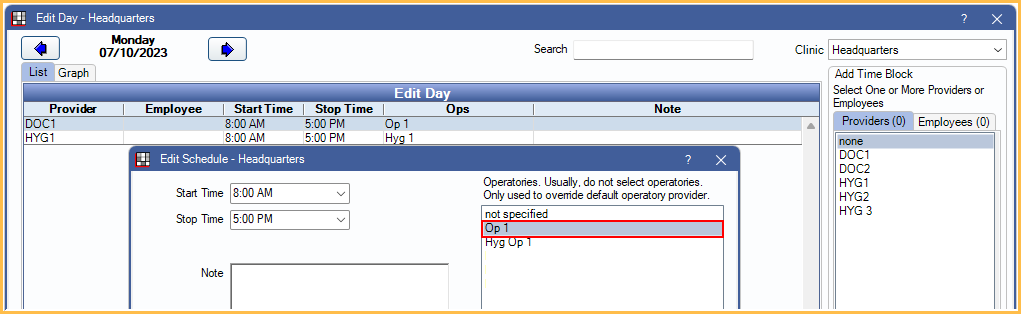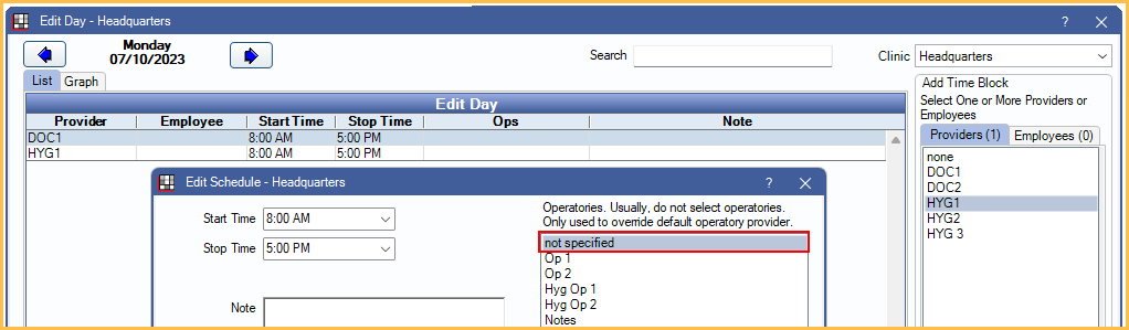 Schedule: Do not assign providers to operatories. Instead, set the provider's available time and select not specified.