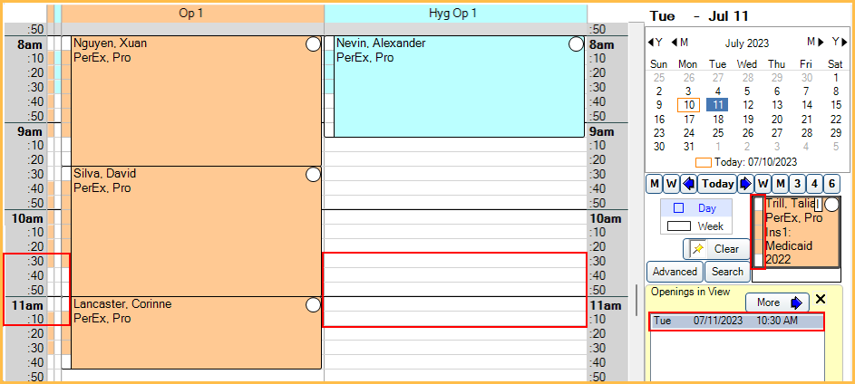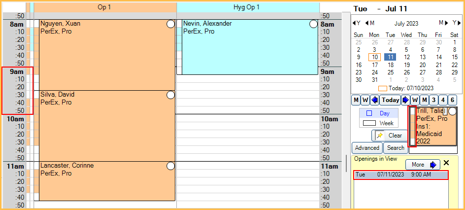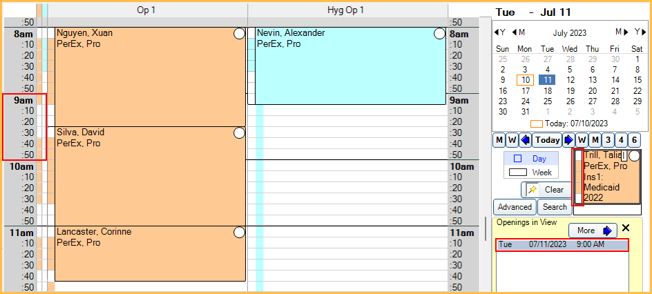 - When the Search Behavior preference is set to Provider Time Operatory, the Appointment Search considers both available provider time and available operatory time. In the example below, the provider is set as the primary provider on the Hygiene operatory and there are three blocks of time available for the appointment to be scheduled.