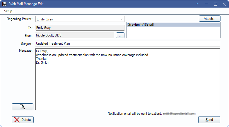 Once sent, the secure message is sent to the patient portal and an email notification is sent to the patient.
