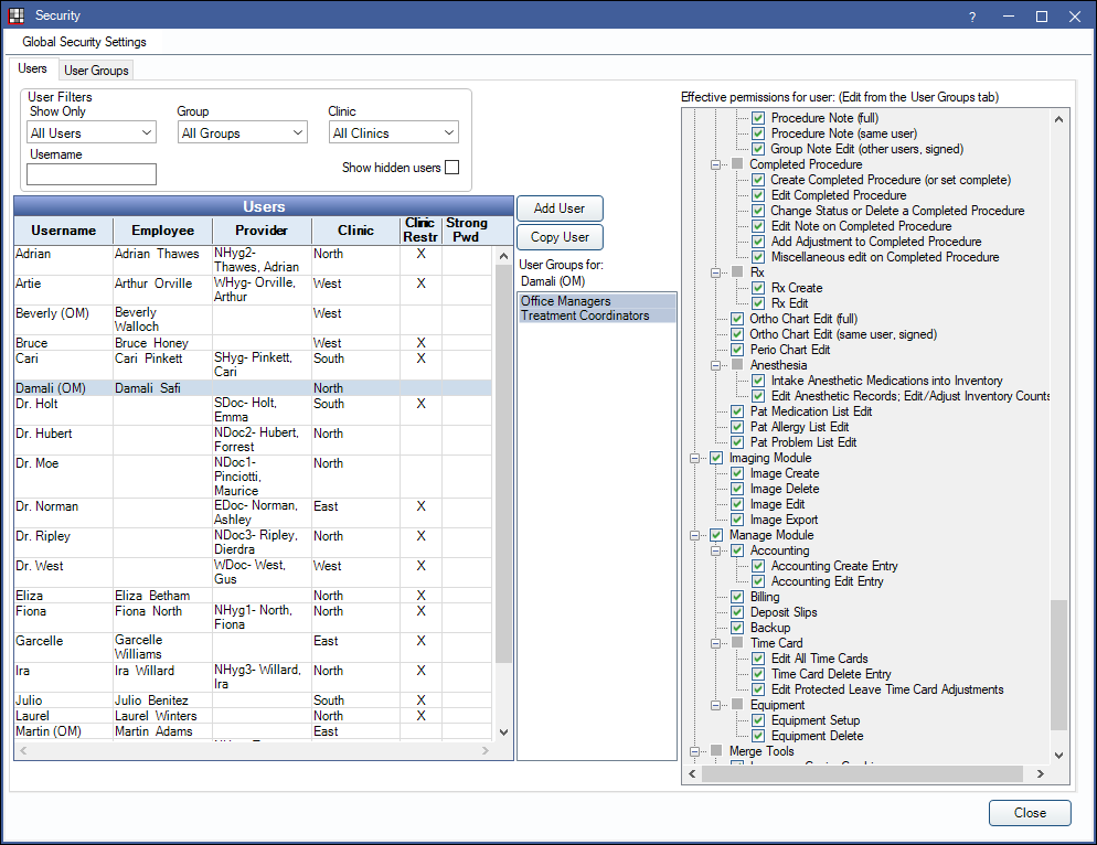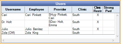 Users: A list of all users that meet the User Filter criteria. Double-click to Edit a User. Below is additional information on the Users grid: