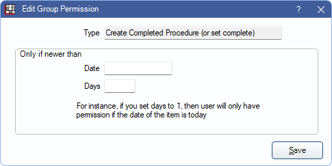 If a box is checked for a permission with a User Group Lock Date, the following window appears. This allows users to prevent alteration of historical data. To set a date limitation, enter a value in the Date or Days field, then click Save to keep changes. If left blank, there is no lock date.