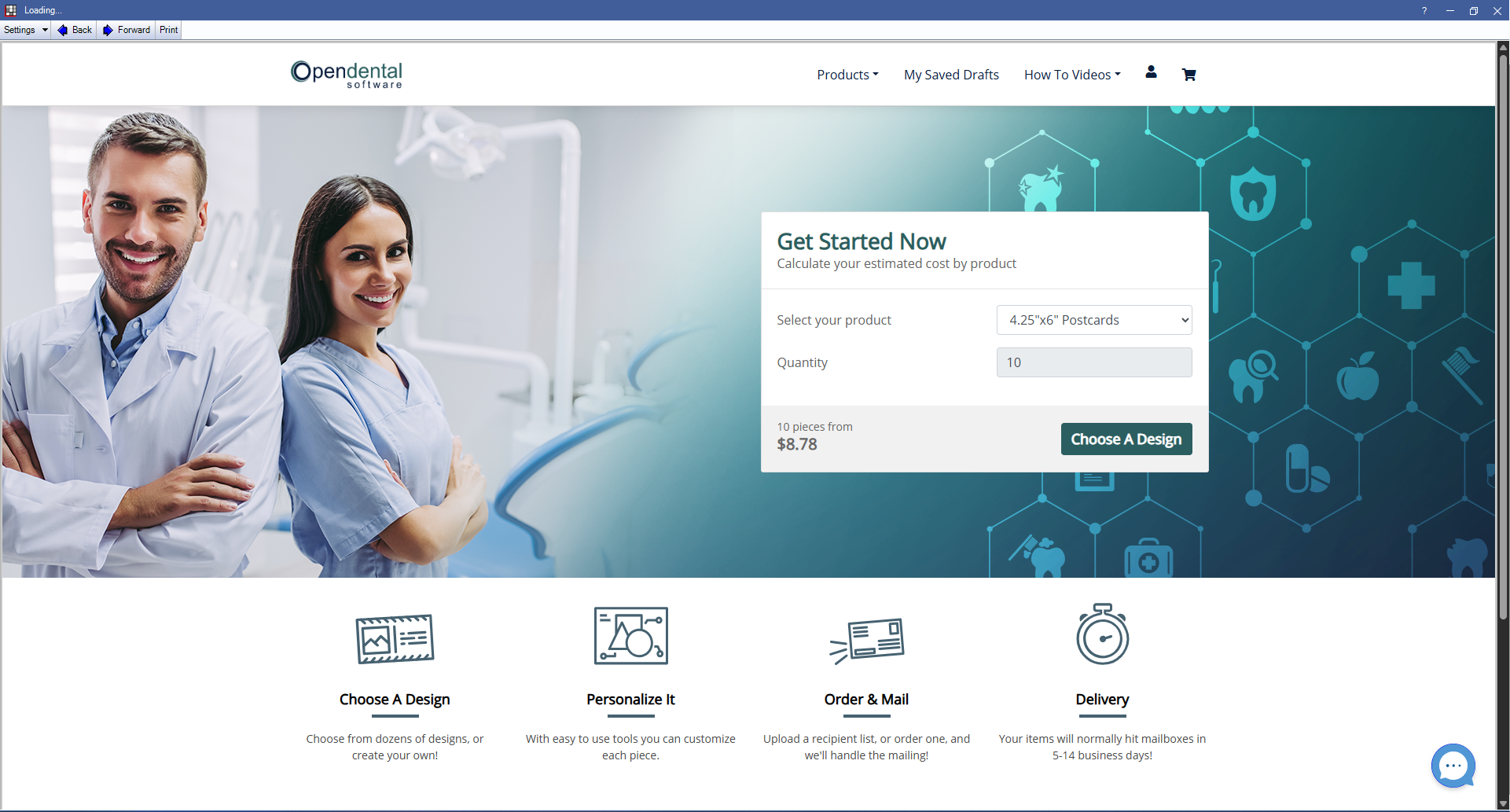 Choose A Design: Select the product and quantity, then click to begin designing a postcard or letter.