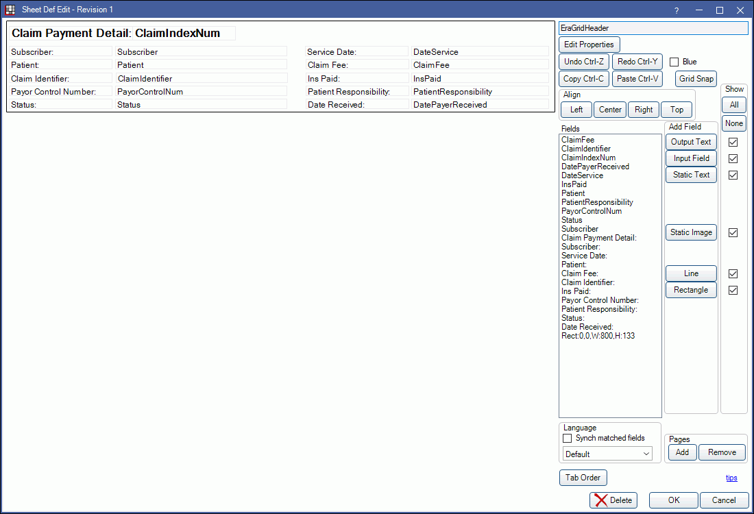 The ERAGridHeader shows above every claim paid on a customized ERA Sheet and can be customized to meet an office's needs.