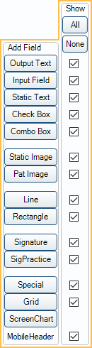 On the left, click a button to add a new Sheet Field. Not all fields are available for each sheet type. Fields not available for the sheet type are not displayed in the Add Field list. To edit existing sheet fields, see Fields below. MobileHeader cannot be added as a field type. The title corresponds to the Show checkbox only.