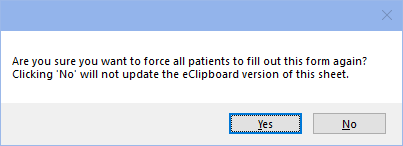 When a sheet is in use for a patient, we use the revision number to determine if an updated sheet is needed. When using eClipboard, and a form has a behavior type of PreFill, patients are prompted to fill a new form. The patient updates the entire form again, not just the fields edited or changed.