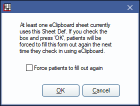 OK: Exit the Sheet Def Edit window and save changes. If making changes to a sheet in use by eClipboard or Web Forms, a prompt displays to update the form in use. See below for details.