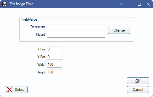 - Click Change to select a document or mount that has been uploaded to the patient's Imaging Module. Change X Pos and Y Pos to change the position of the image on the sheet. Change the Width and Height to change the size of the image. Click OK to add the field to the sheet.
