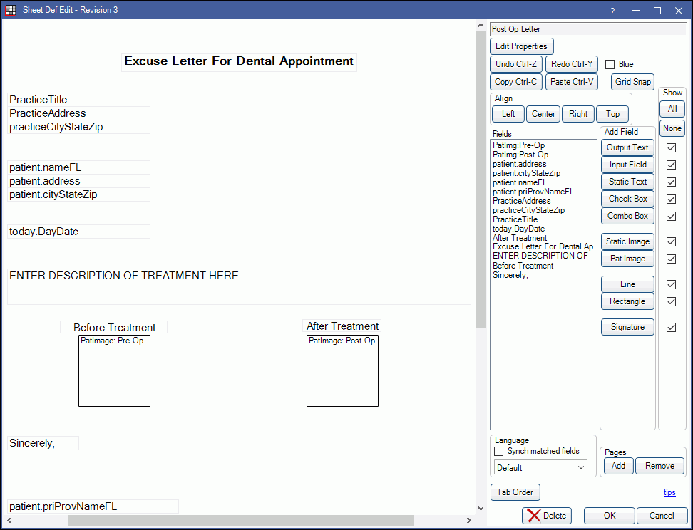 Below is an example of how an office might include patient images (Pat Images) in this type of sheet. To use multiple patient images, save each image in a separate Images category because only the first image from each category is pulled.