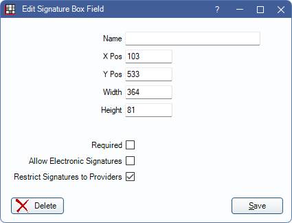 Required: Check to require the user to sign the generated form before saving it. This field cannot also be marked as Restrict to Providers when this is checked.
