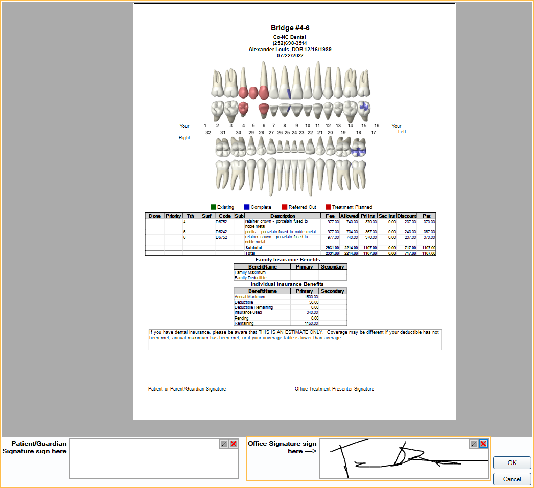 If the Treatment Plan Sheet Def Defaults includes the SigPractice field, when Signing a Saved Treatment Plan users will be prompted for both a patient and a Patient/Guardian and Office Signature.