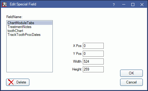 Width / Height: The width and height of the image.The tooth chart will always have a fixed width to height ratio. Text size may not change even if the size of the field is increased.