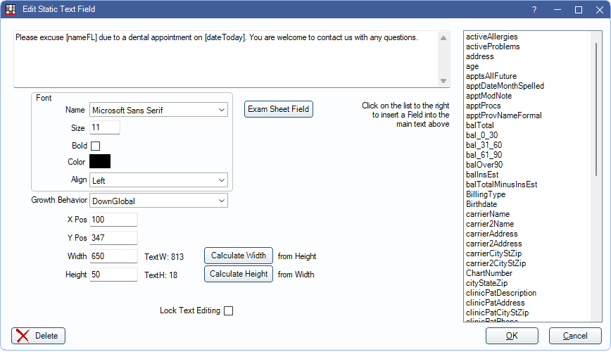 Exam Sheet Field: Insert a field from a custom Exam Sheet within the Static Text box. See Edit Exam Sheet Field on this page for more details. Available for Patient Letter Sheets,Referral Slip Sheets, and Referral Letter Sheets.