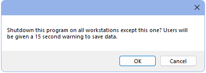 Once an option is selected, the following prompt appears. This gives users on the selected workstations 15 seconds to save any changes before the program closes.