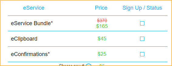 - The increased price for using a landline number for Integrated Texting or eConfirmations display in green. The eService Bundle price remains the same.