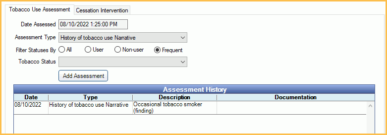 Current Smoking Status: Click the dropdown to select the patient's current smoking status. The available options are based on SNOMED CT codes. If none is selected, the status will not be counted in the numerator. Only one status selection per day will be added to the Assessment History. This status affects the percentage calculation for EHR Smoking Status.