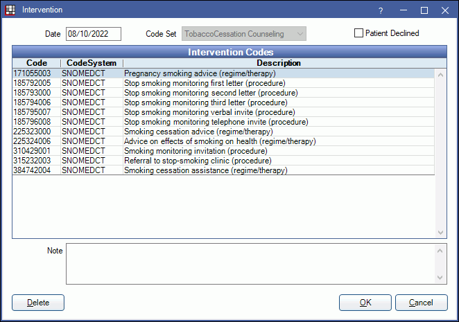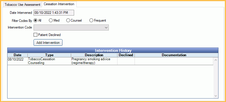 - Code Set: Defaults to TobaccoCessation Counseling.