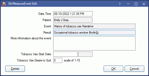- Tobacco Use Desire to Quit: Rate the patient's desire to quit using tobacco on a scale of 1 - 10. Informational only.
