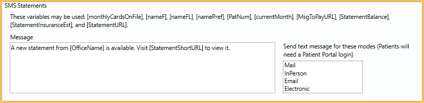 Message: Edit the default message for statements that are sent by SMS (text) via the Billing List. This text box supports right-click options.