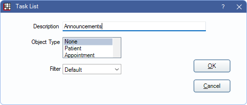 - Patient: Task Lists with this type selected are listed automatically when users select Tasks from the Main Toolbar. This should be selected when setting up an inbox.