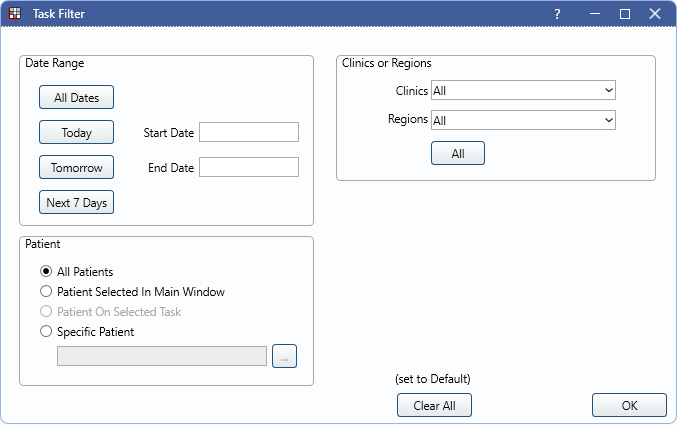 - Clinic or Region: Choose clinics or regions to filter tasks. Only one type can be selected. Click All to change the current Clinic and Region selections to All which includes Unassigned clinics and regions. Tasks with Object Type None are not filtered.