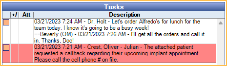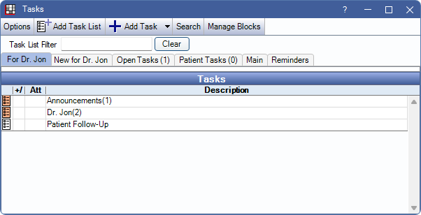 Task Lists and Tasks are managed in the Tasks Area, and can be used for office communications, reminders, patient lists, daily, weekly, or monthly check off lists, etc.