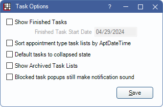 - Sort appointment type Task Lists by AptDateTime: If checked, Task Lists that have Object Type set as Appointment are grouped by scheduled and unscheduled appointments, then sorted by appointment date and time, rather than the date and time the Task was created.