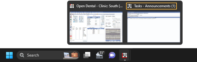 The Task popout window displays the number of new (i.e., unread) Tasks in the selected Task List. Hover over the Open Dental icon on the taskbar to view. Task count only shows when the Tasks window is open and a Task List or tab is selected.