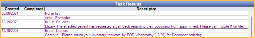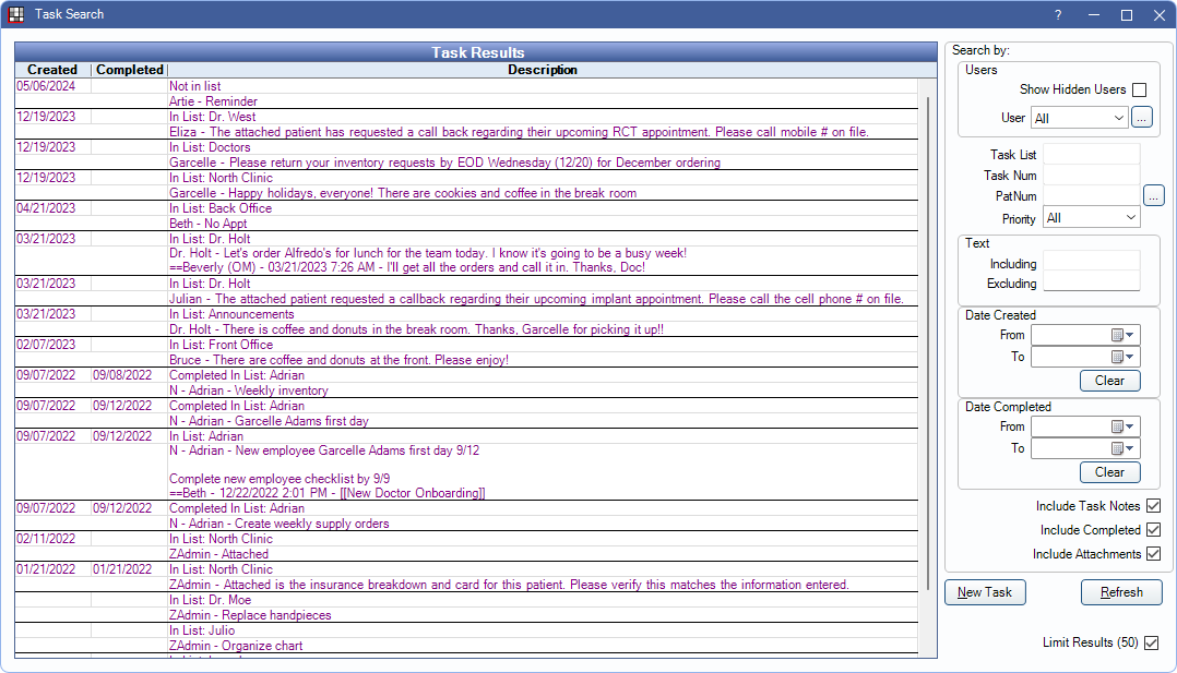 - PatNum: Search for tasks associated with a patient number (for tasks that have a Patient type only).