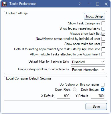 Default Filter for Tasks in Lists: Only available when Clinics are enabled. Allows users to filter the Task List by the clinic associated with the patient or appointment on the Task.
