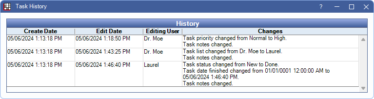 Click History to open Task History. A summary of Task changes is displayed. Only available when the user has the TaskEdit permission.
