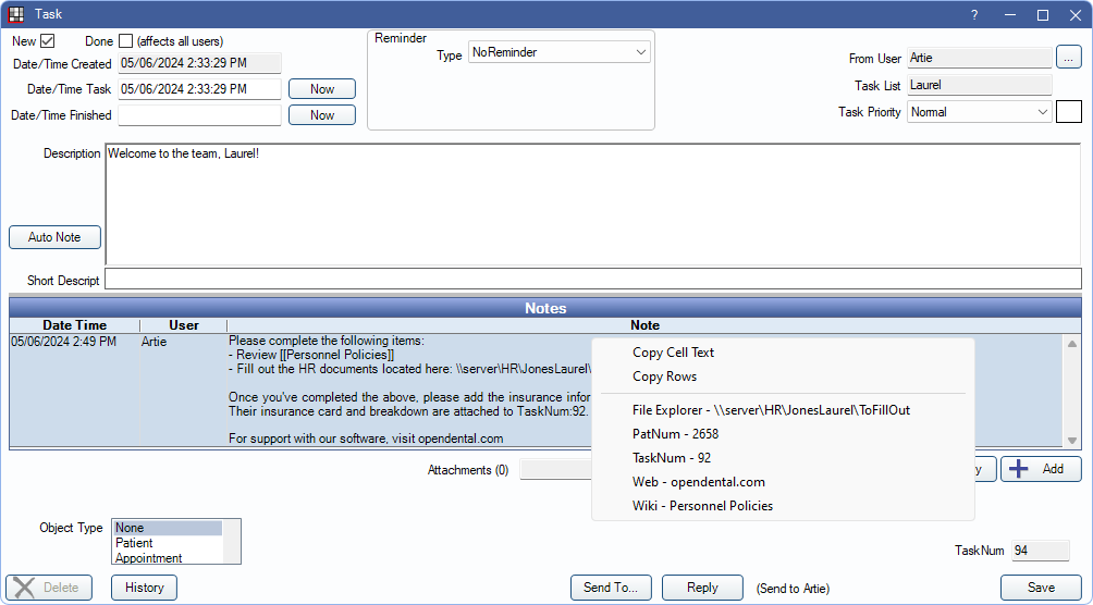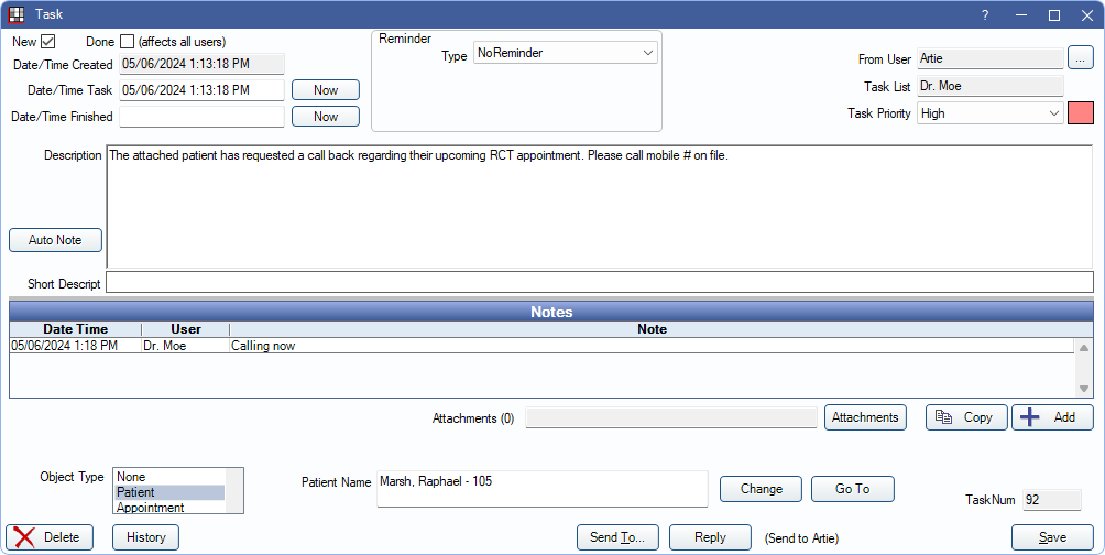 Object Type: Attach a Task to an appointment or patient. Attached patient related tasks to an appointment or patient to quickly access the patient or jump to the appointment.