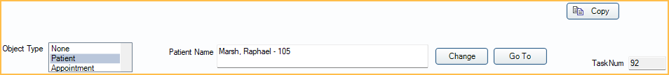 Go To: Changes the currently selected patient to the patient attached to the Task. When the object type is Appointment, the active module changes to Appointments Module and jumps to the date of the appointment in the calendar.