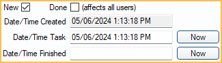 Date/Time Finished: Auto-populates with the date and time the Task was marked done or set complete. Click Now to enter the current/date time (does not mark done).