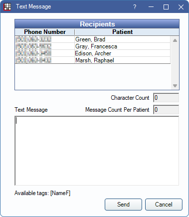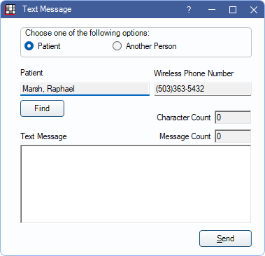 Find: Only available when Patient is selected. Open Select Patient to search for a different patient to text.