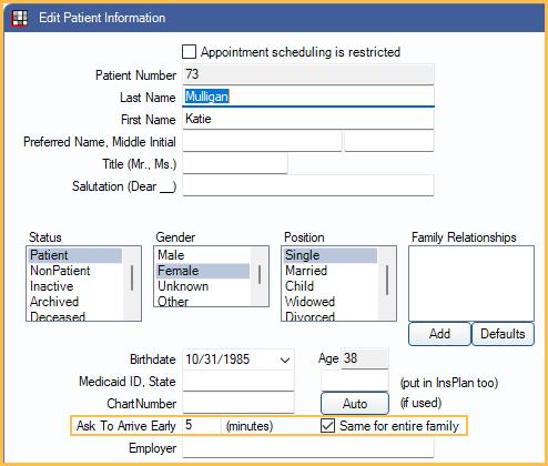 Additionally, check Same for entire family to apply the early arrival time to everyone in the patient's family.