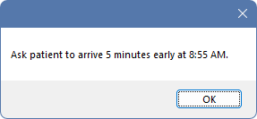 When a value for Ask To Arrive Early has been entered in Edit Patient Information, this message appears immediately upon creating or selecting a patient's scheduled appointment. The Time Ask To Arrive is automatically prefilled on new appointments for the patient.
