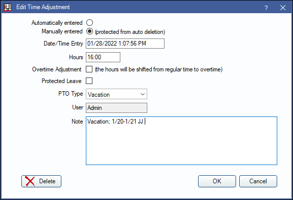 - Manually entered: Indicates this adjustment was entered manually and protects this adjustment from being deleted from auto deletion.