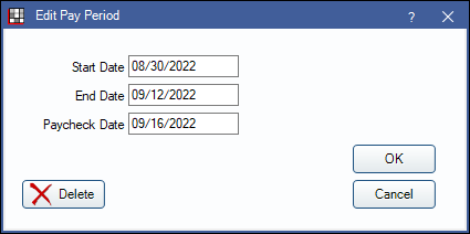 Pay Periods: This grid shows pay periods that have been created. Double-click an existing pay period to edit. The Edit Pay Period window (see below) will open.
