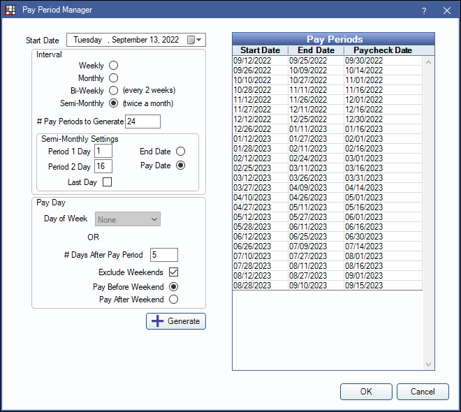 In the screenshot above, employees will be paid five days after the pay period end date, as long as it doesn't fall on a weekend. If it does, employees will be paid on the Friday before. - Generate: After setting pay period criteria, click to create pay periods.