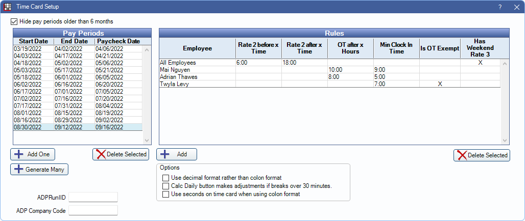 Hide pay periods older than 6 months: Checked by default. Determines which pay periods show in the Pay Periods grid.