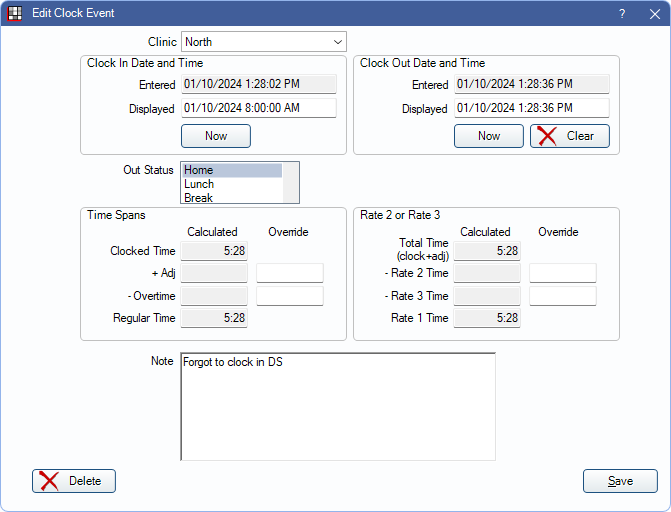 - Note: Enter a note for a clock event, usually when an employee must change the time or type of the clock event.